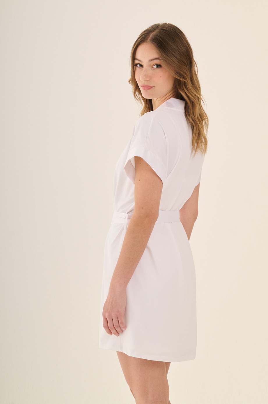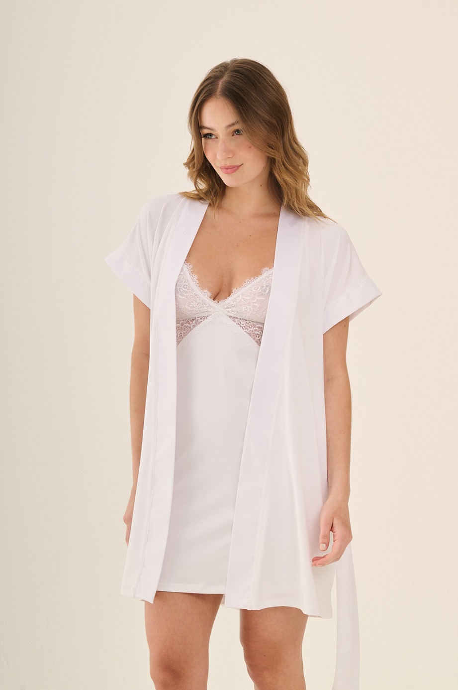 Bata de microfibra blanca con bordado delicado en la espalda. Ligera, elegante y con una caída seductora: el complemento perfecto para una noche especial. Tela: microfibra suave con sutil elasticidad.