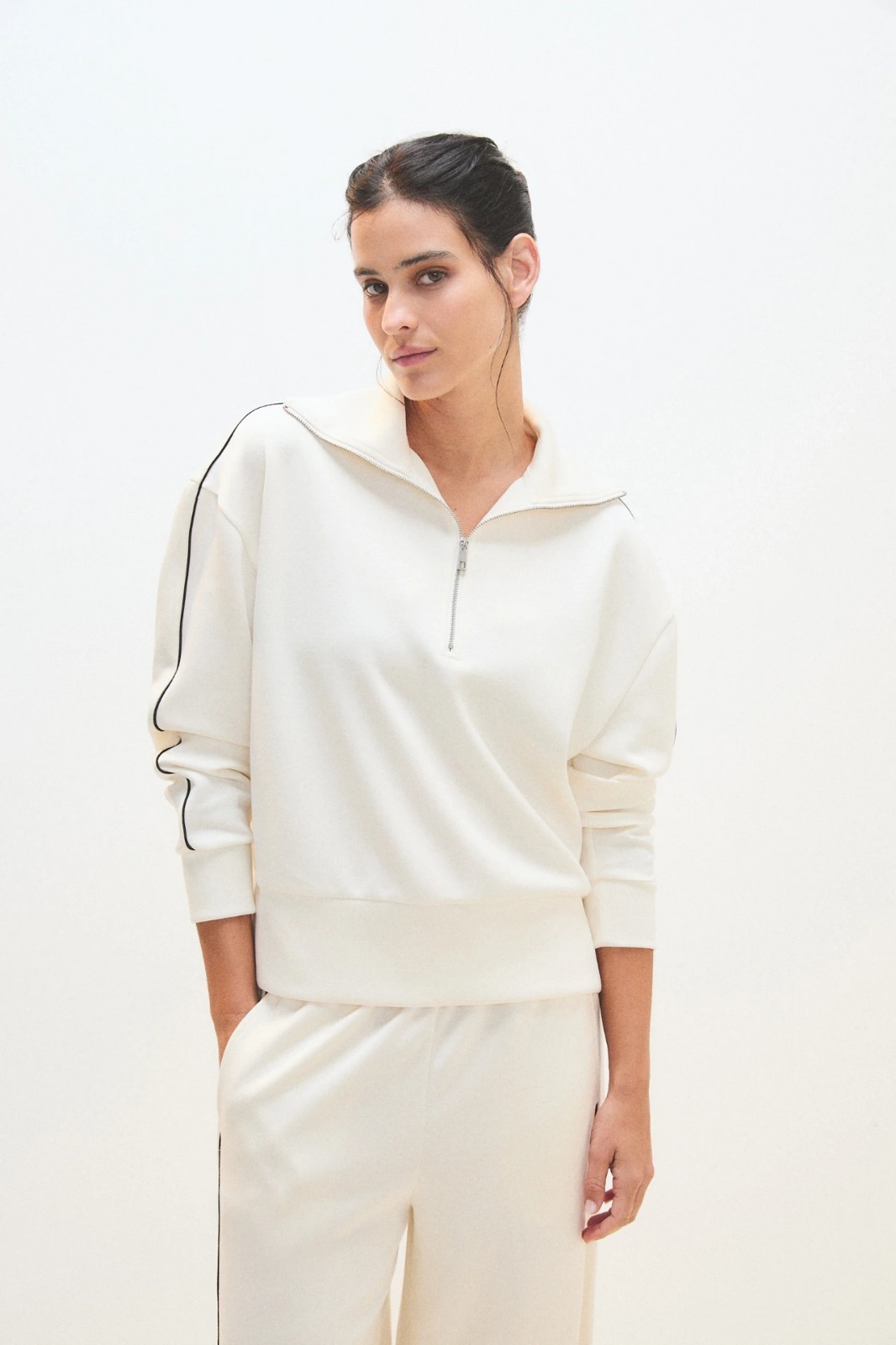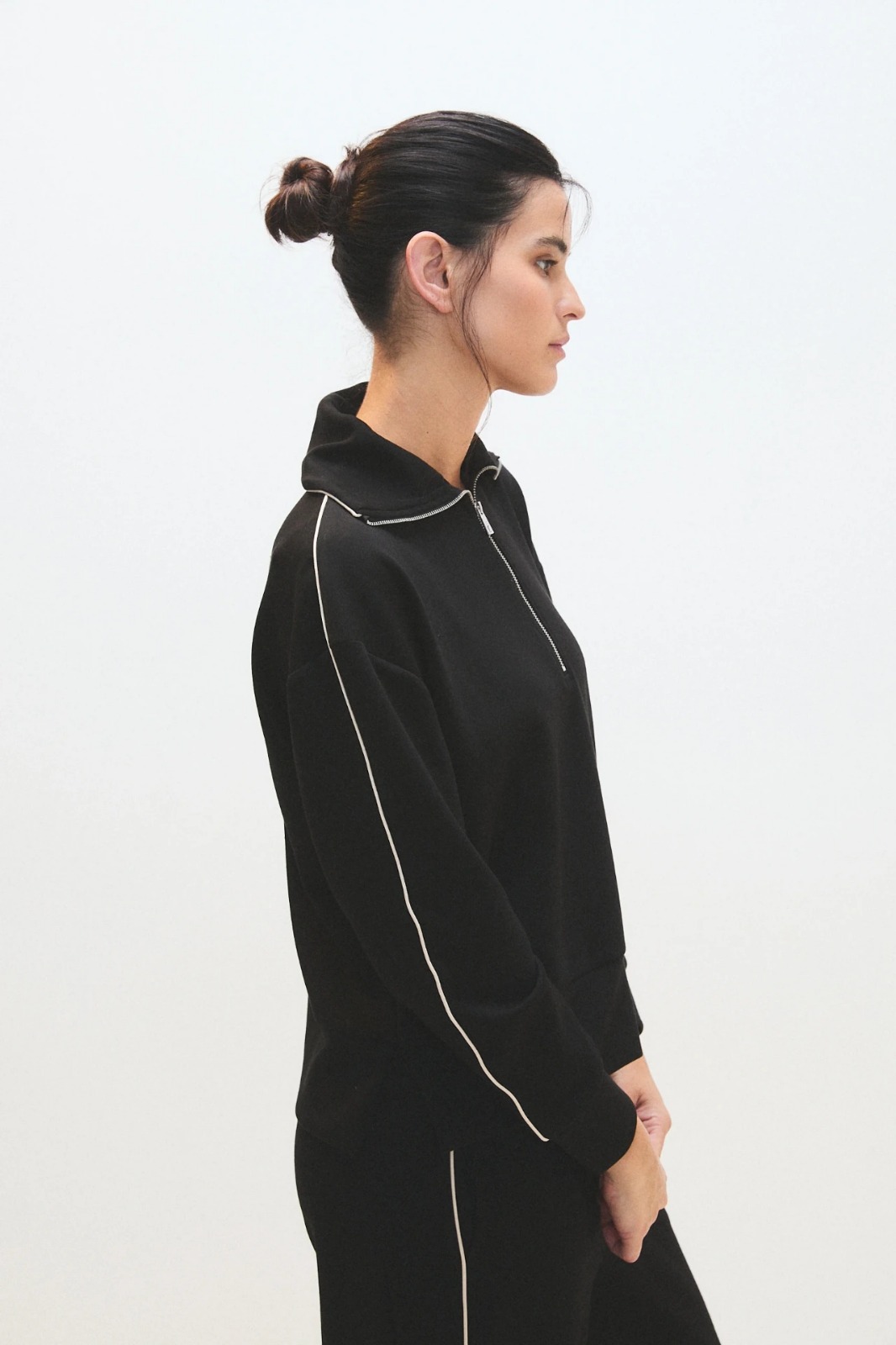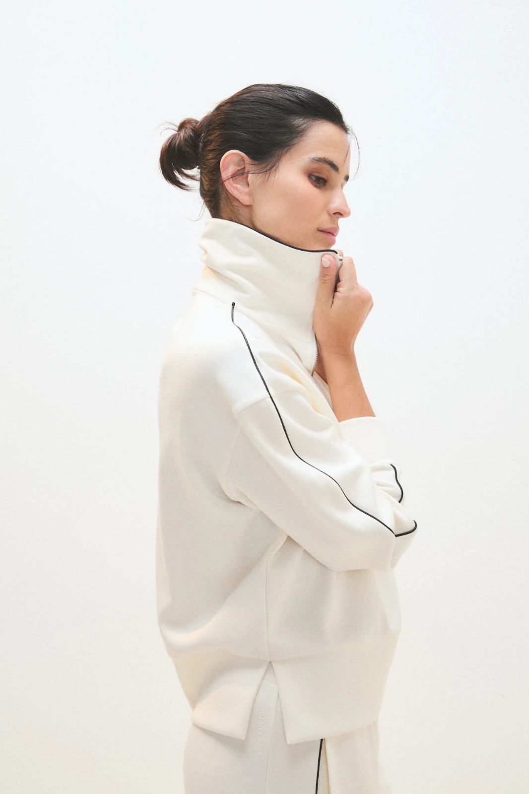 Buzo deportivo de Jersey pesado con tacto suave. Con detalles de vivos a contratono y logo estampado. Es una propuesta funcional, moderna y versatil.