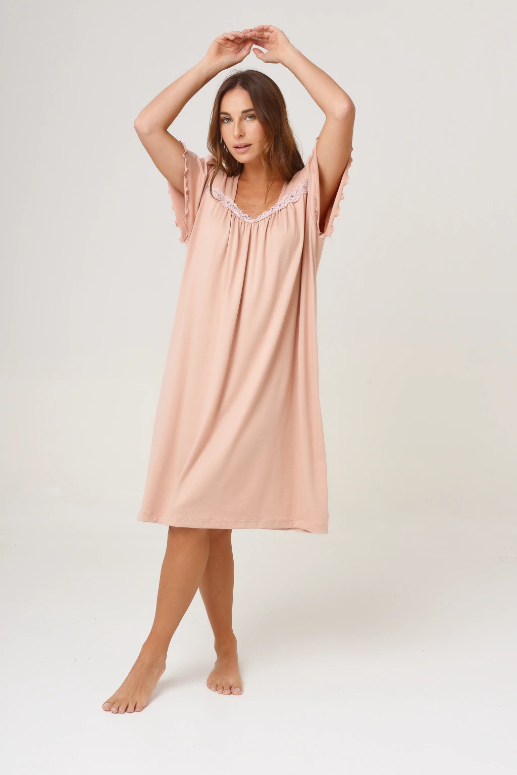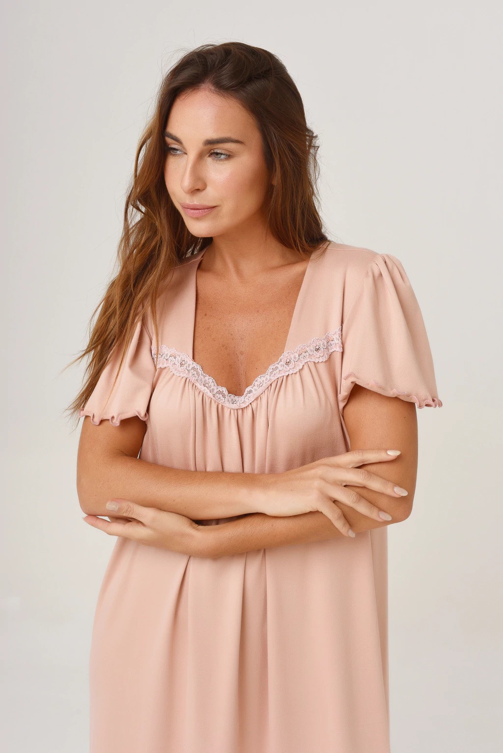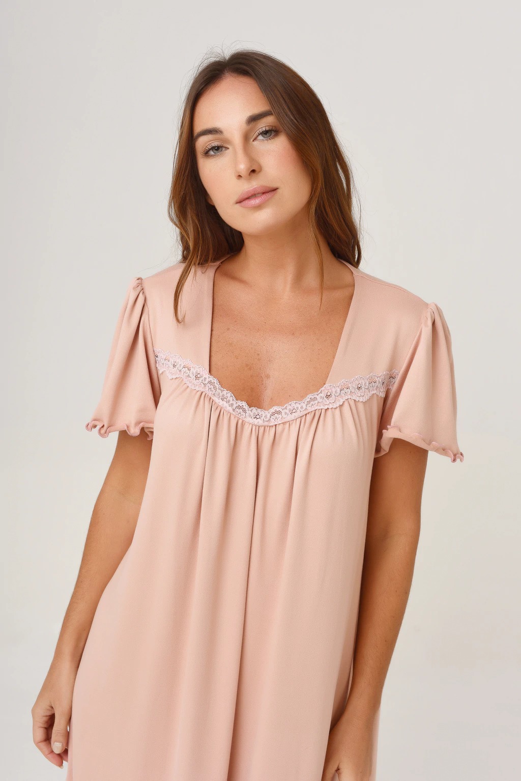 Camisón manga corta de jersey viscosa con lycra, detalles de puntilla en el cuello