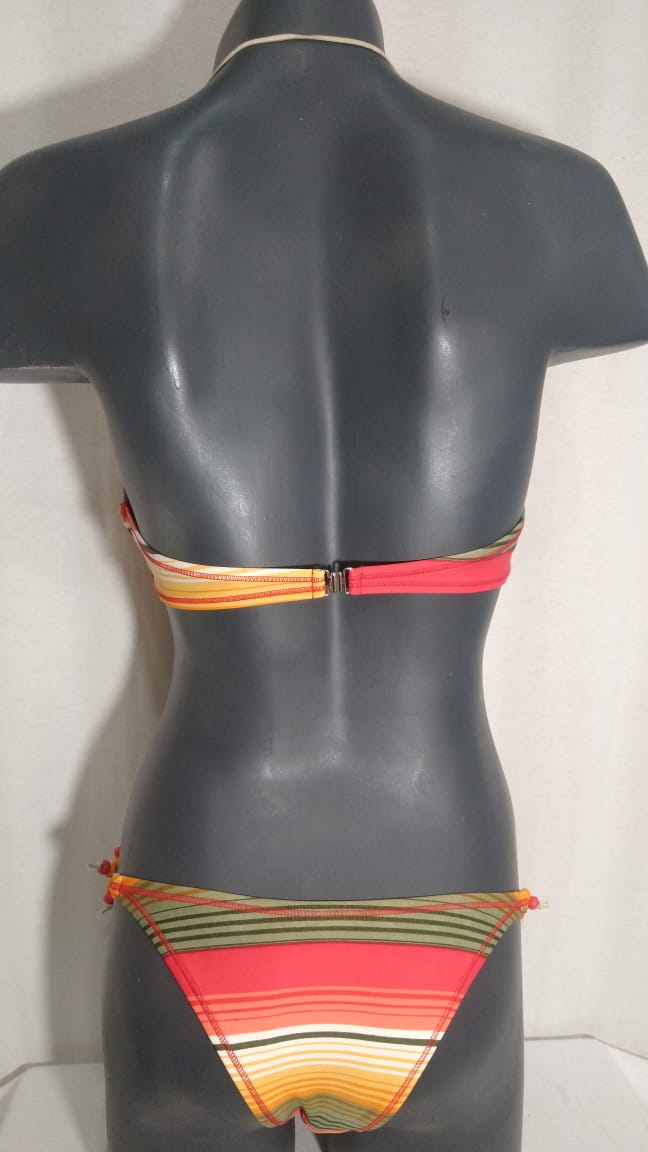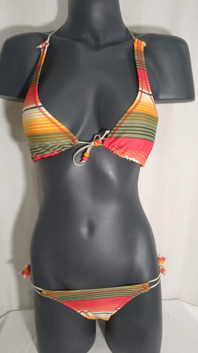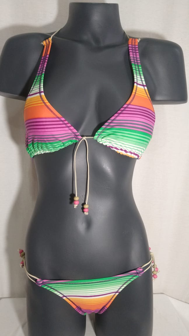Conjunto de bikini, corpiño triángulo y bombacha vedetina. Confeccionado en lycra estampada forrada