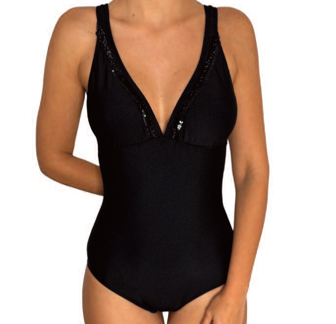 Malla entera de lycra forrada, con galon de lentejuelas, escote marilyn