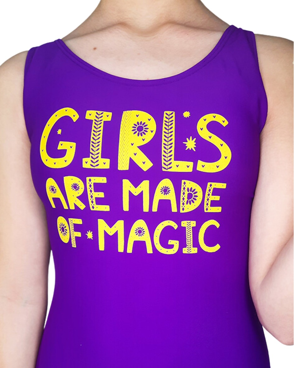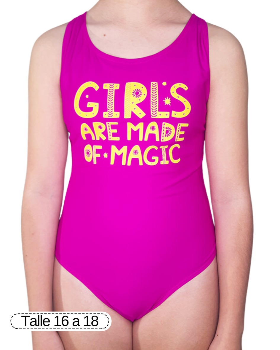 Malla entera de lycra forrada, con estampa en el frente. Corte ideal para niñas y adolescentes