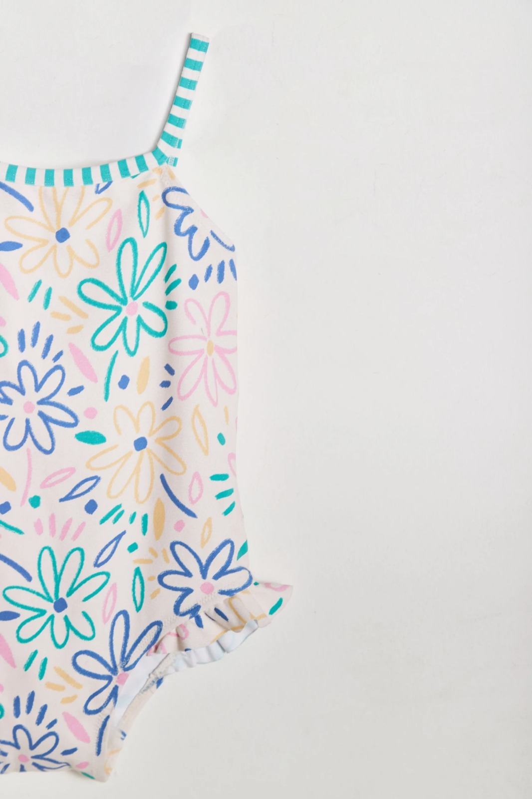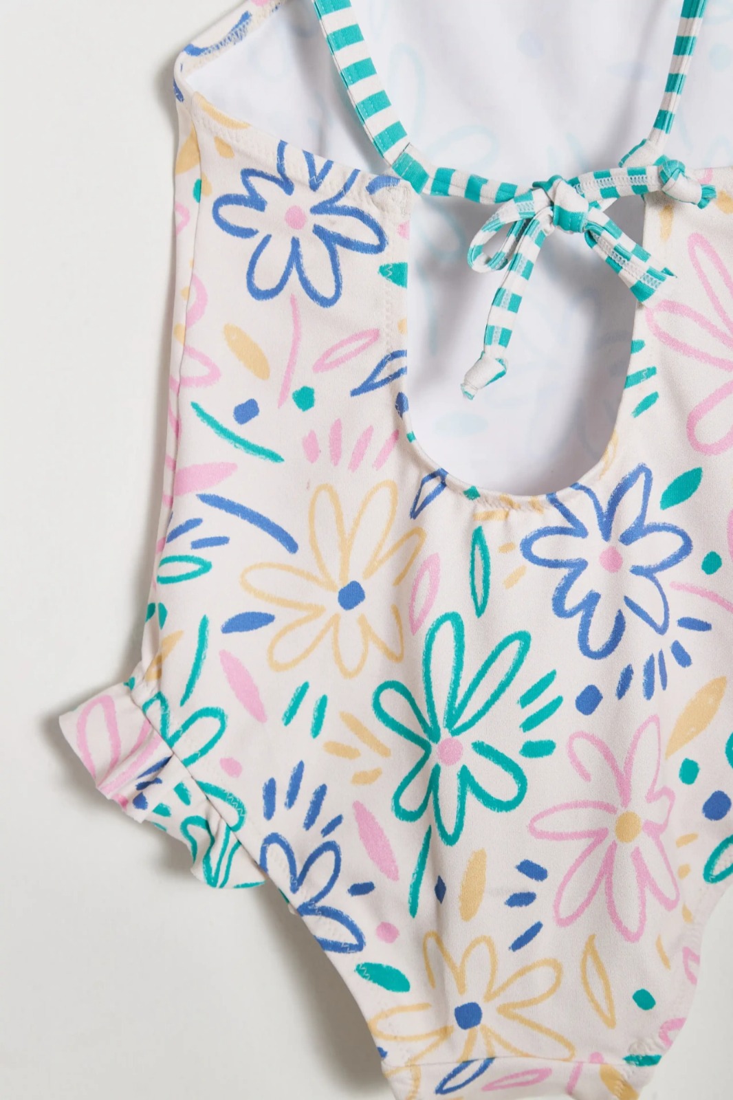 Traje de baño entero Mini Spring de microfibra estampada con volados. El tejido tiene protección solar UPF +50.