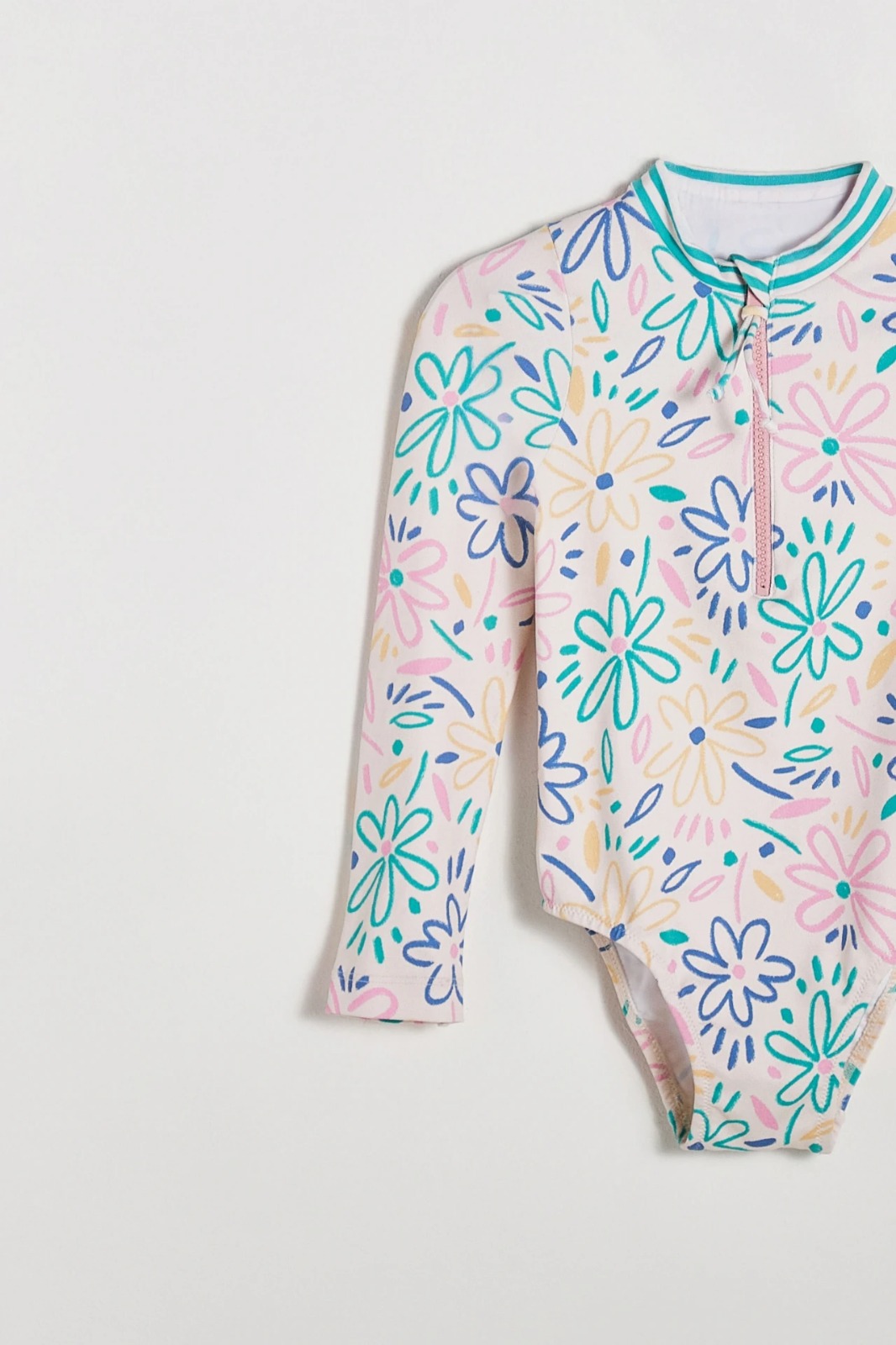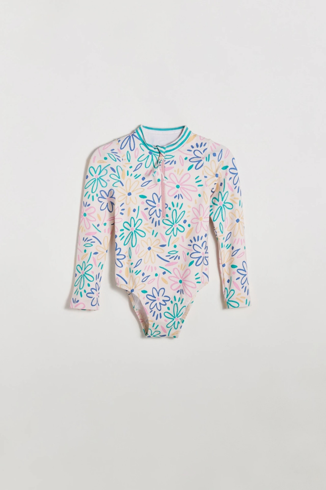 Traje de baño entero ML Mini Spring de microfibra estampada. Con cierre en el delantero. El tejido tiene protección solar UPF +50.