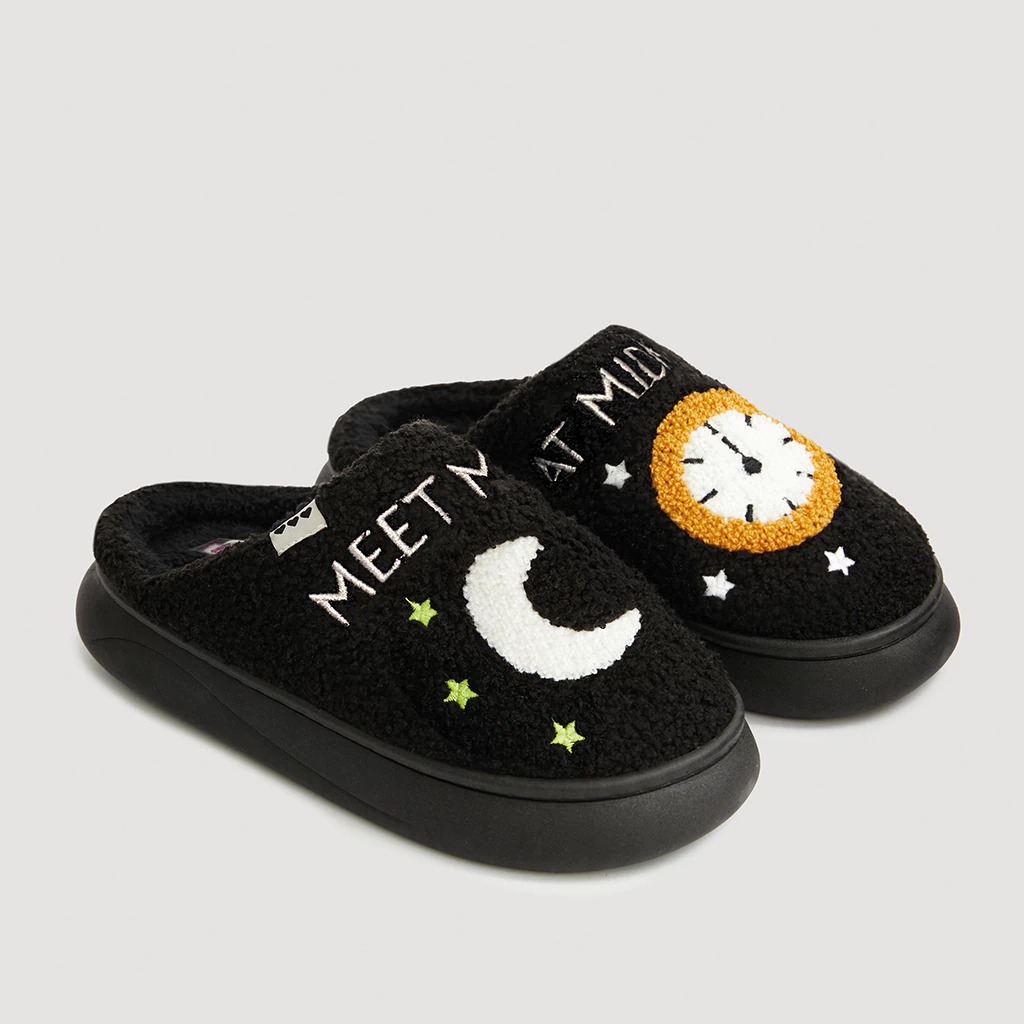 Pantufla tipo mule perteneciente a la línea Midnight, confeccionada en bouclé suave con estampa nocturna. Su diseño cómodo y mullido es ideal para uso en casa durante el invierno.