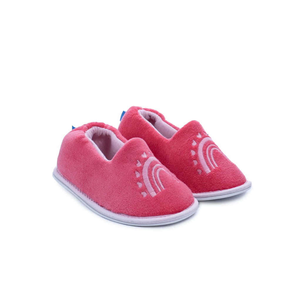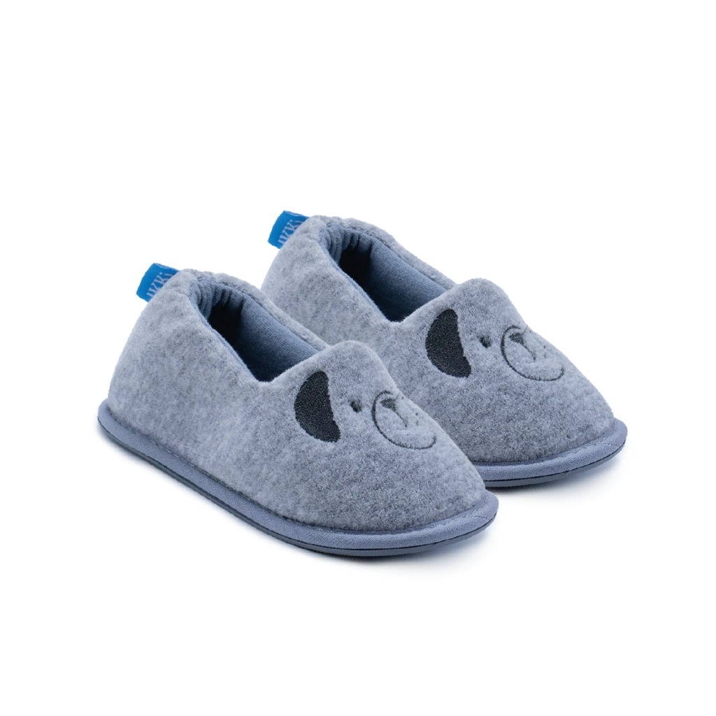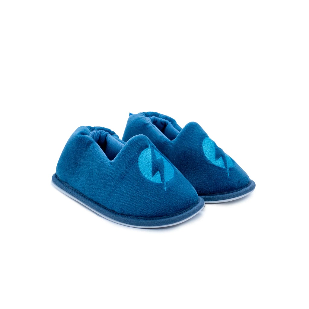 Pantufla de niños, de plush con bordado. Con elástico en el talón y plantilla acolchada. Base de P.V.C. cosida.
