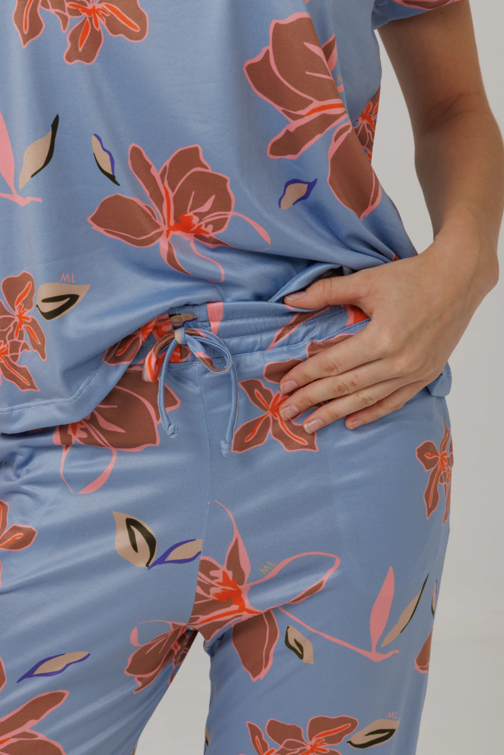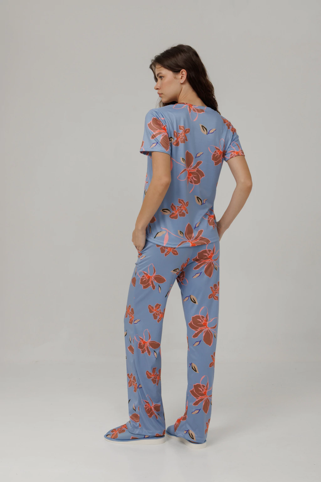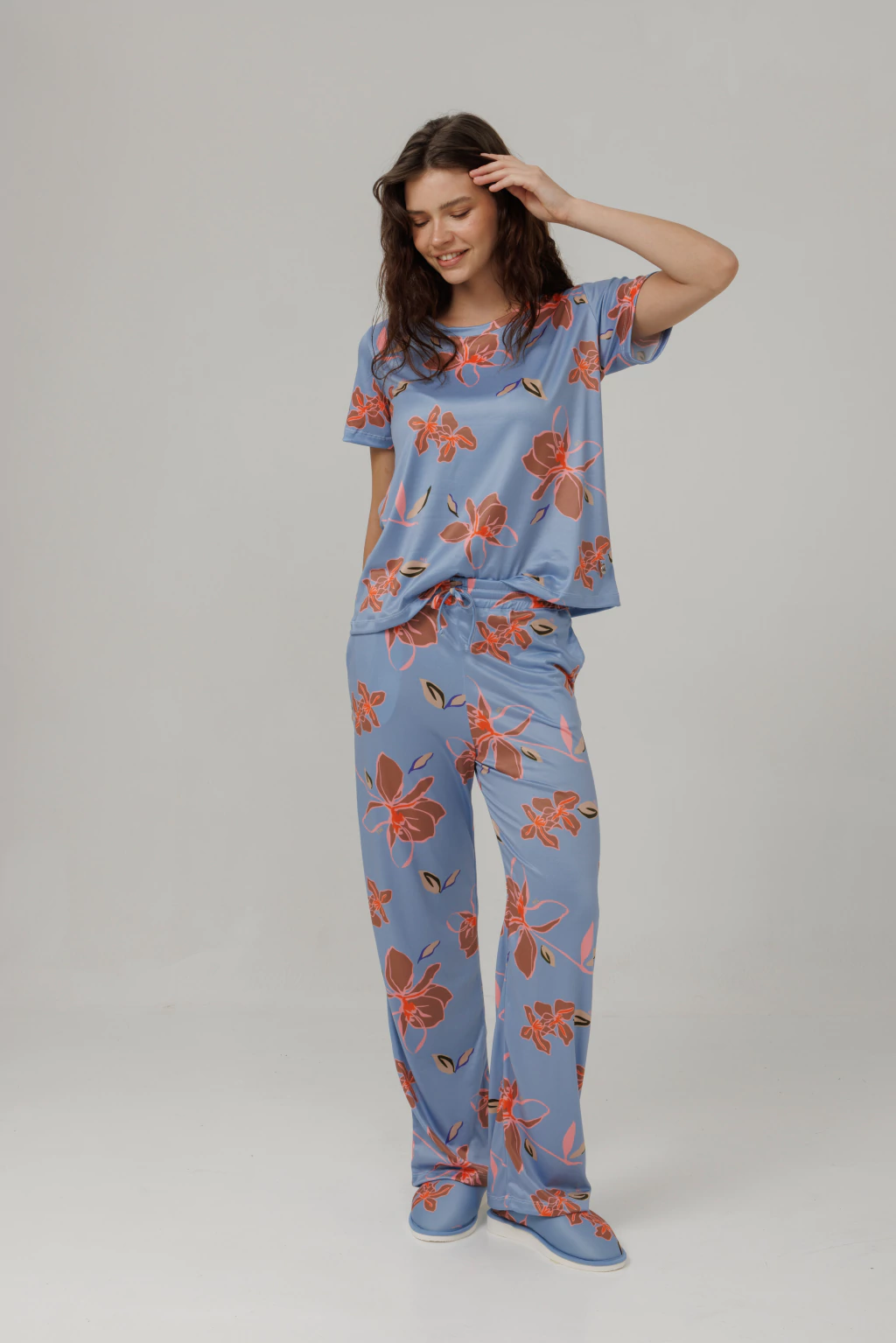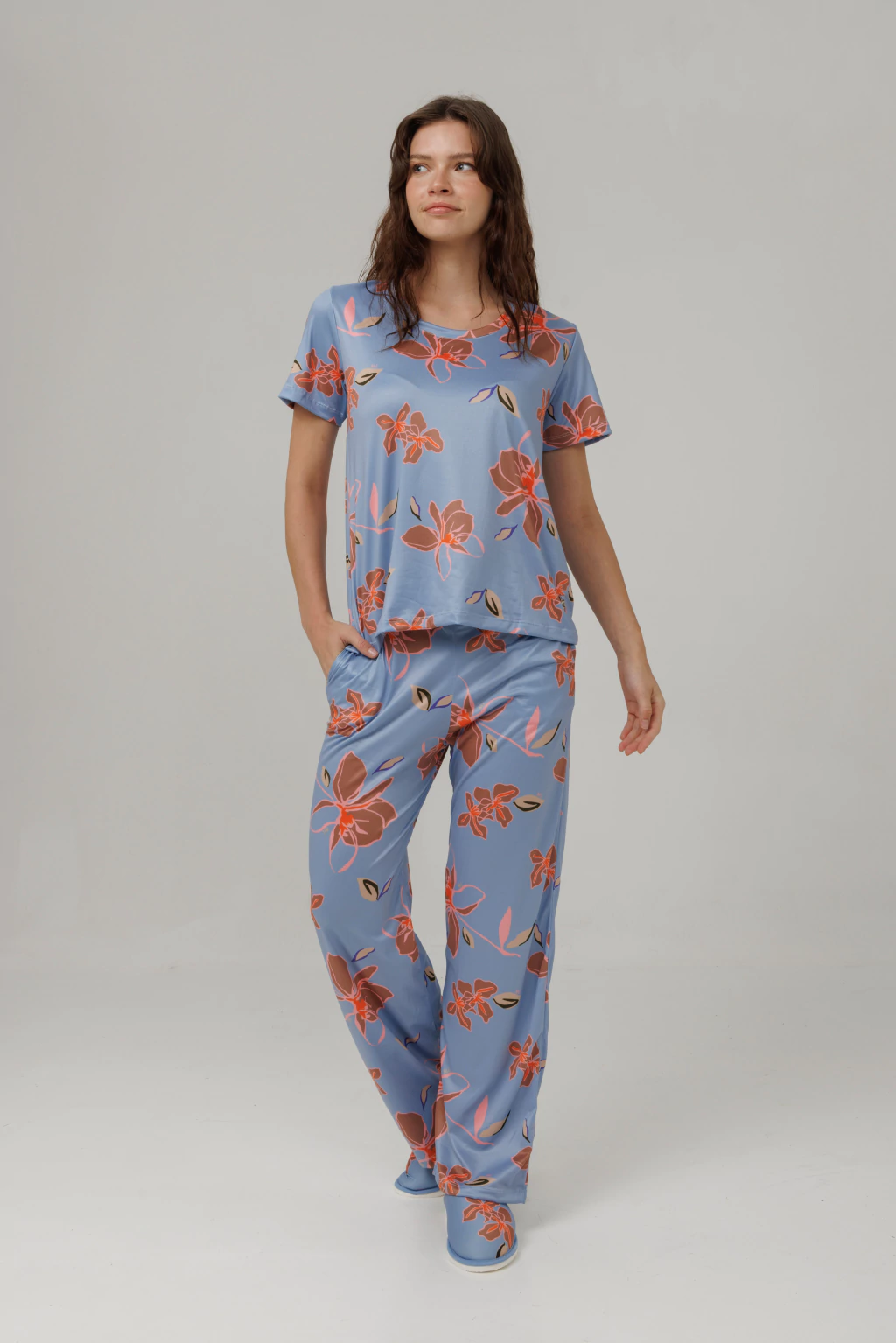 Conjunto de modal de remera manga corta corte recto y pantalón recto tiro medio con elástico en cintura y tira para atar y ajustar.