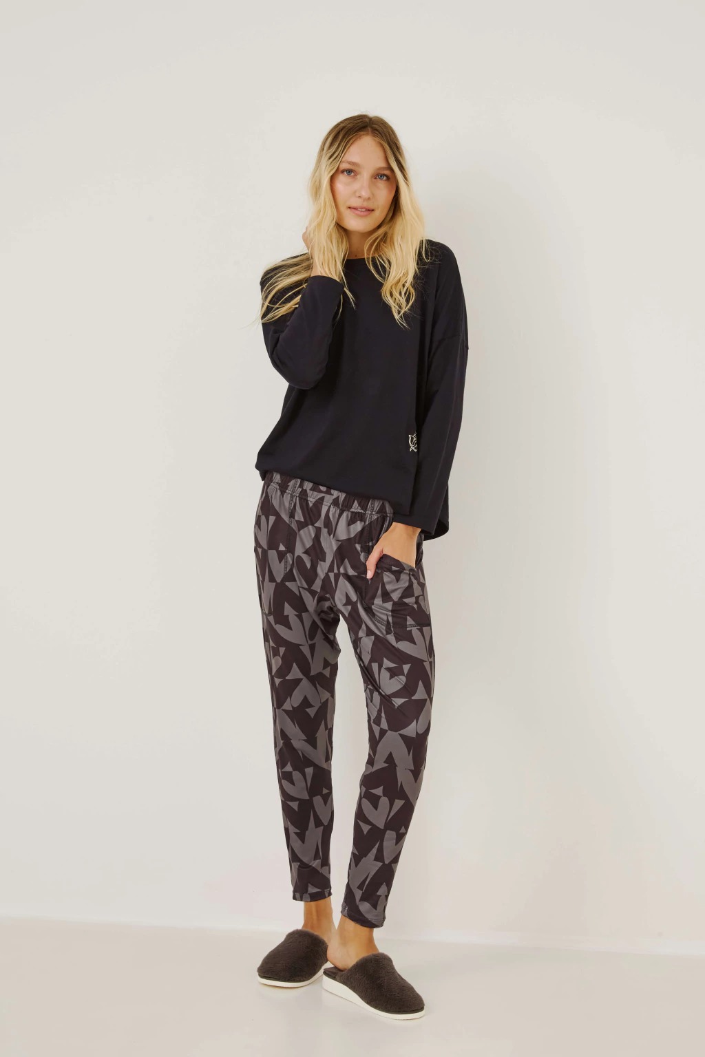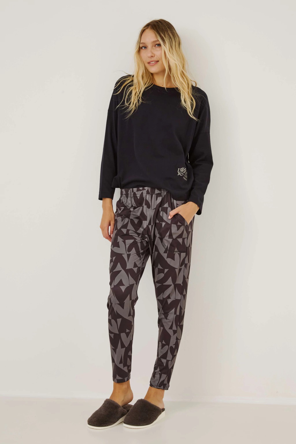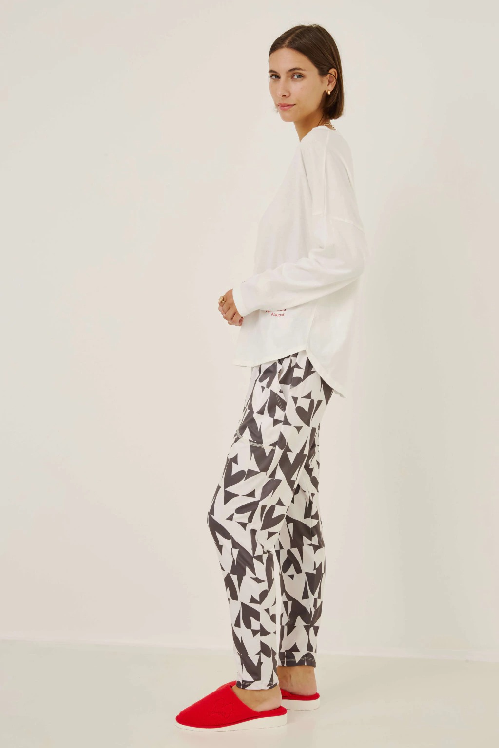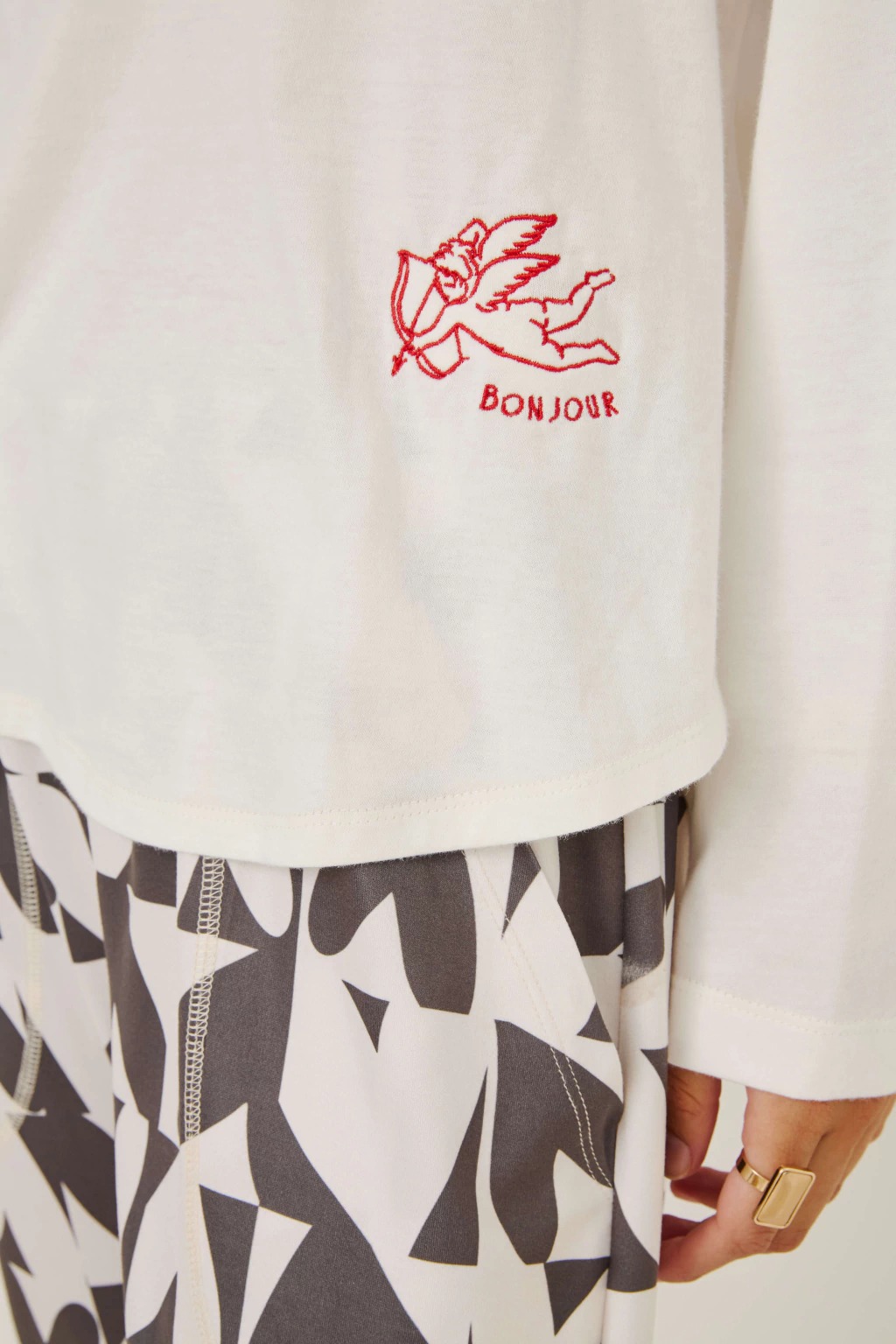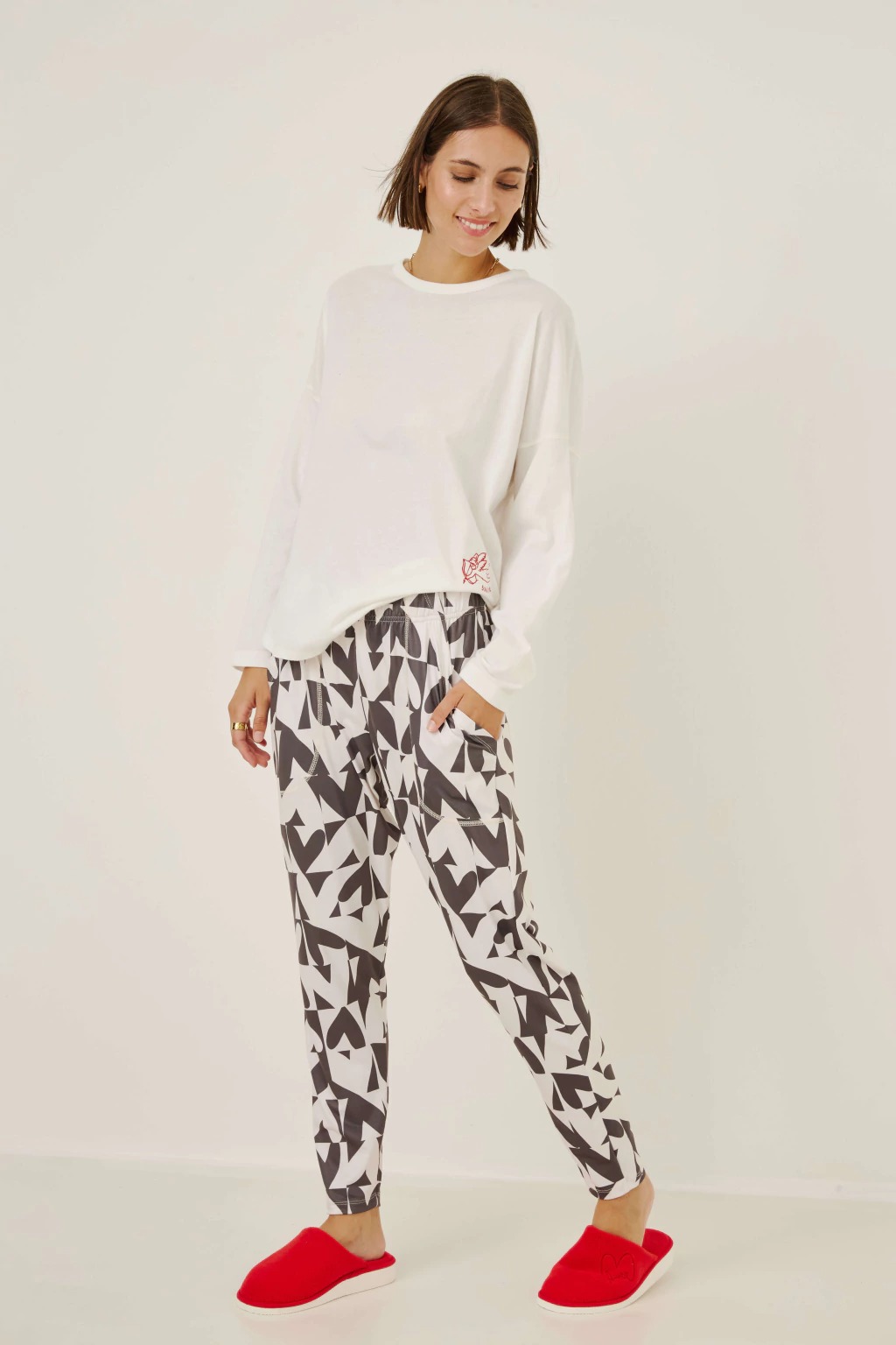 Descubrí el confort y la suavidad del Pijama Cupido. Confeccionado 100% en algodón esmerilado y jersey gamuzado con lycra estampado, combina calidez y elasticidad para acompañarte en tus momentos de descanso. Su diseño de manga larga y babucha garantiza un calce cómodo y delicado sobre la piel. Ideal para quienes buscan relax y estilo en casa, disfrutá de noches placenteras con un toque especial.