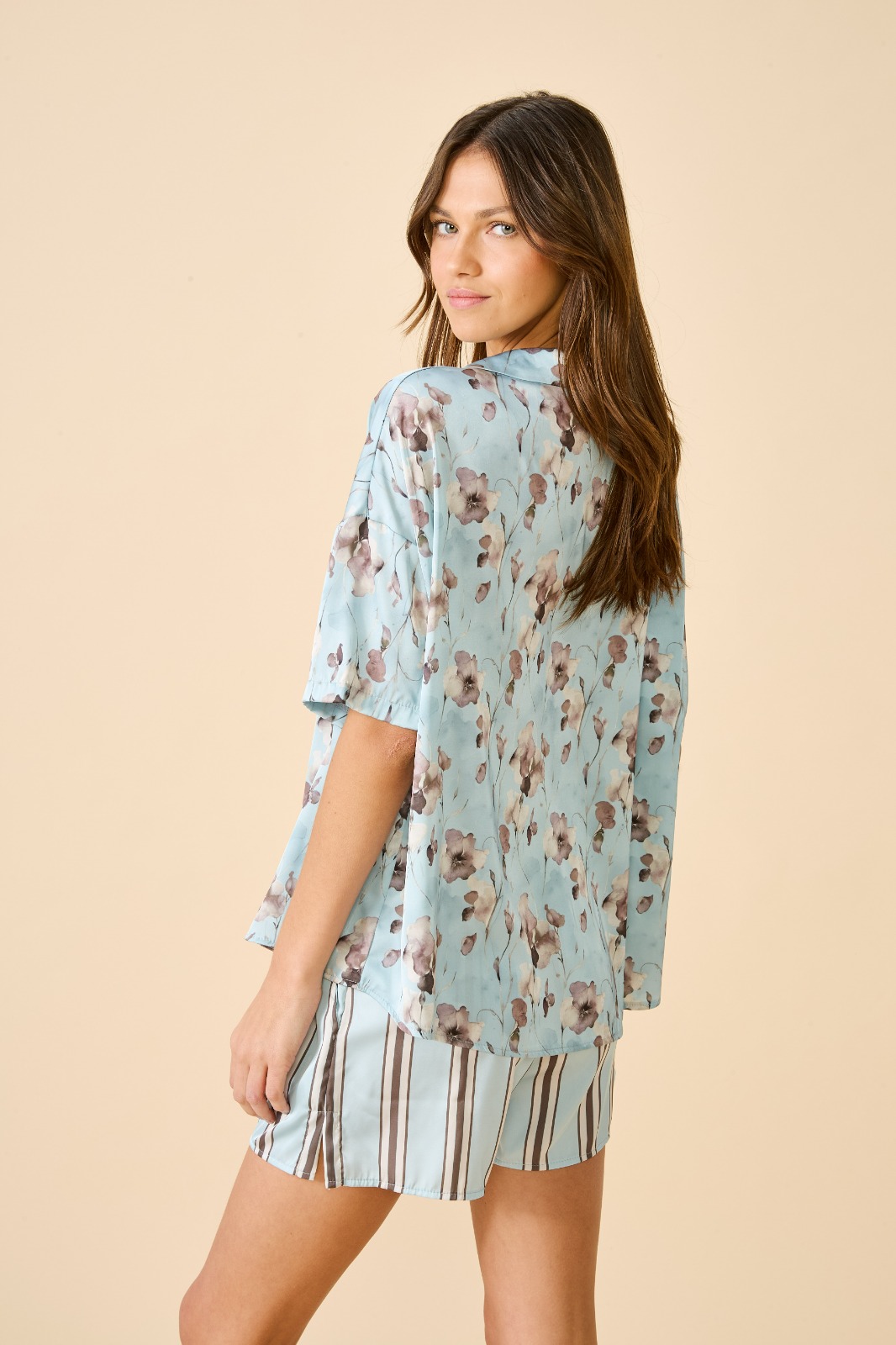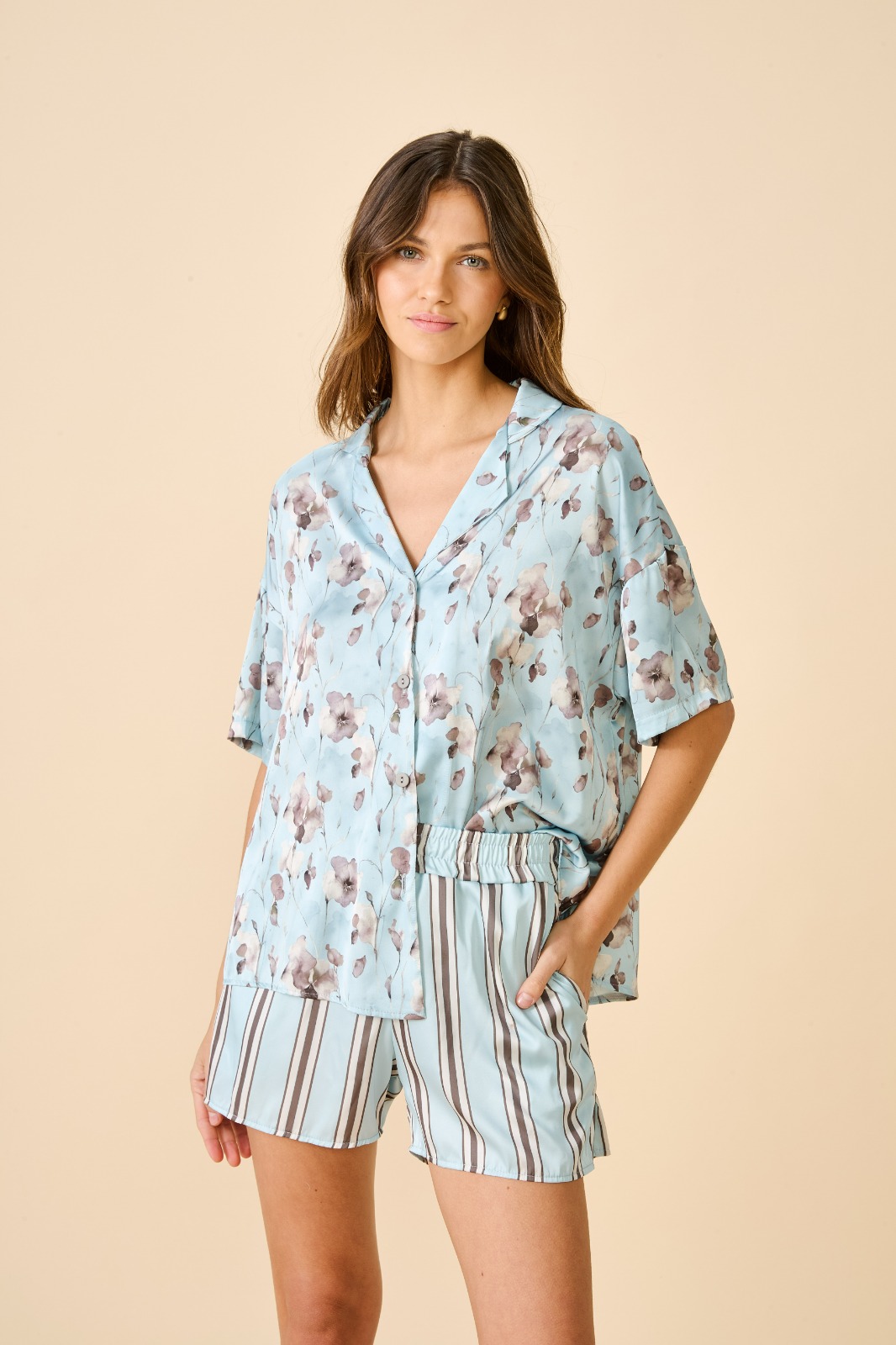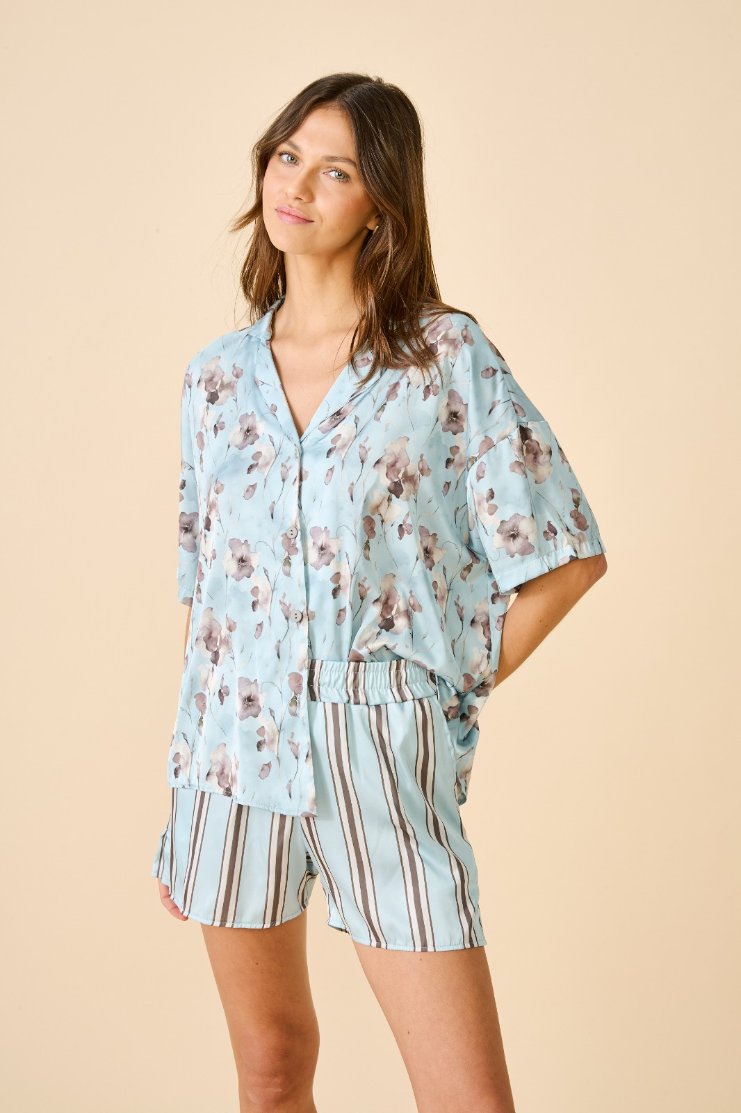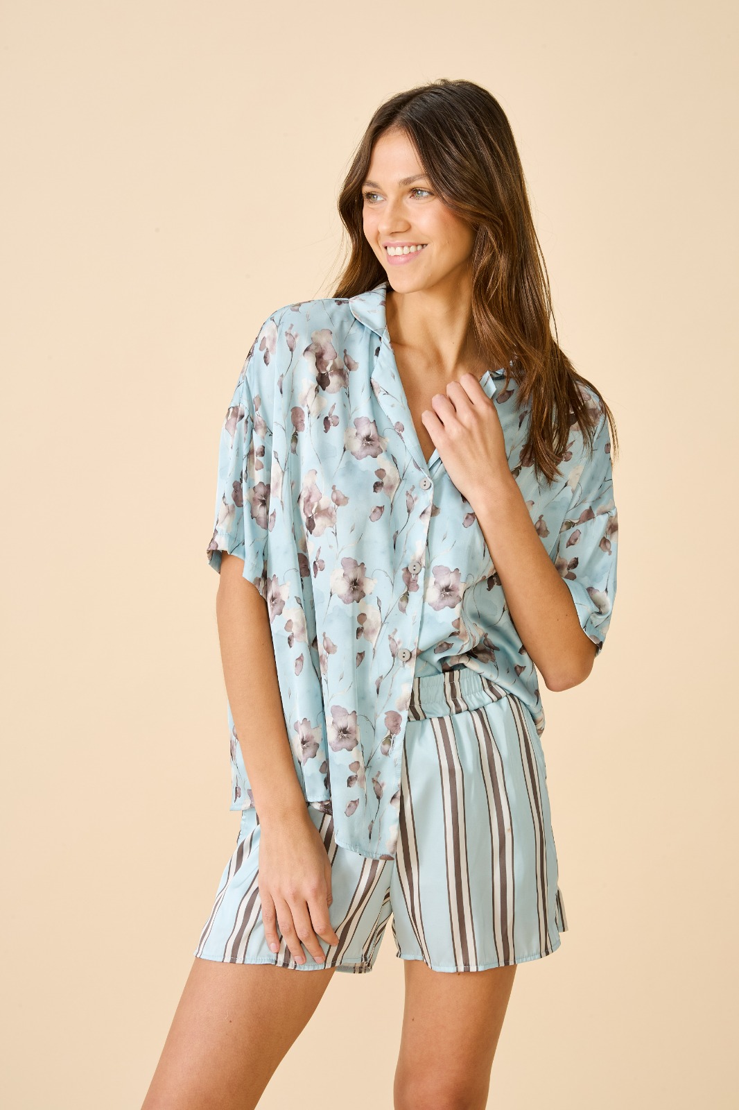 Pijama camisero, manga corta con short. De satén estampado