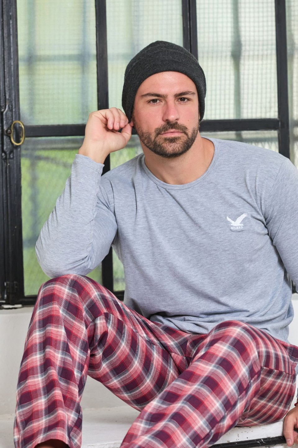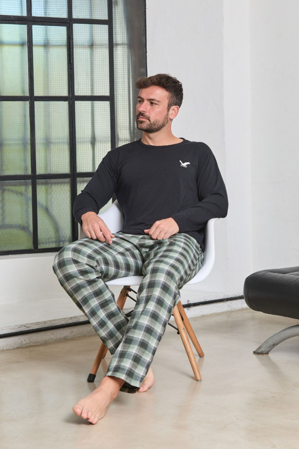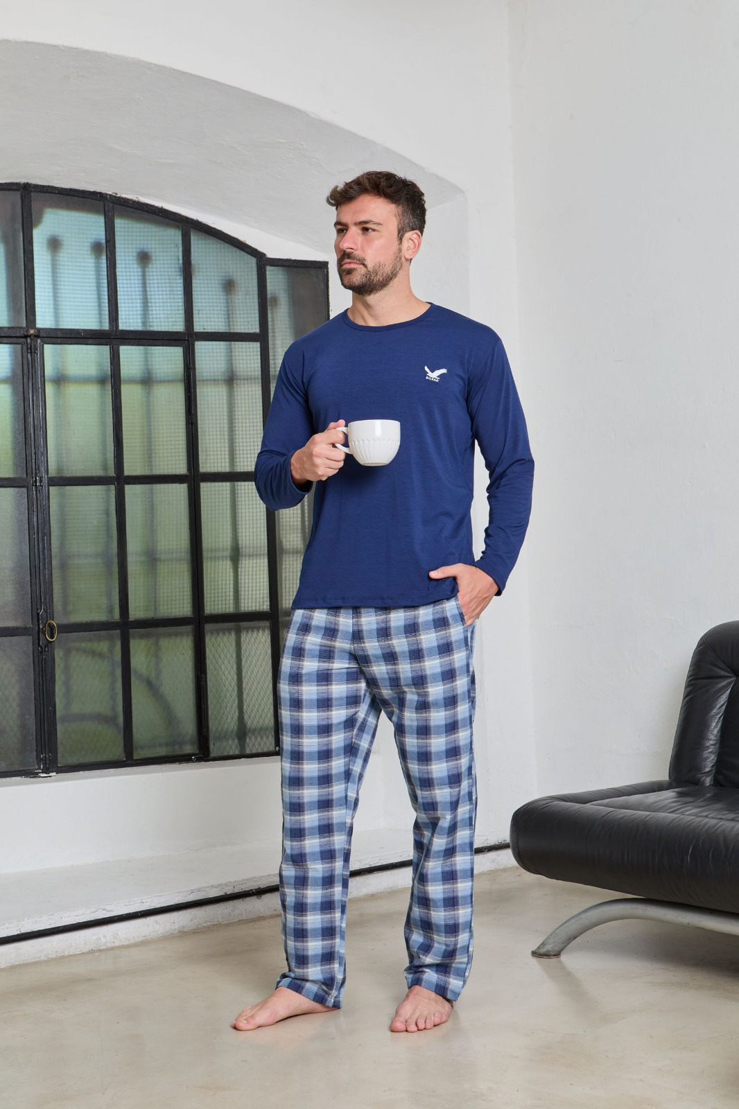 Pijama de hombre con pantalón a cuadros y bordado en remera