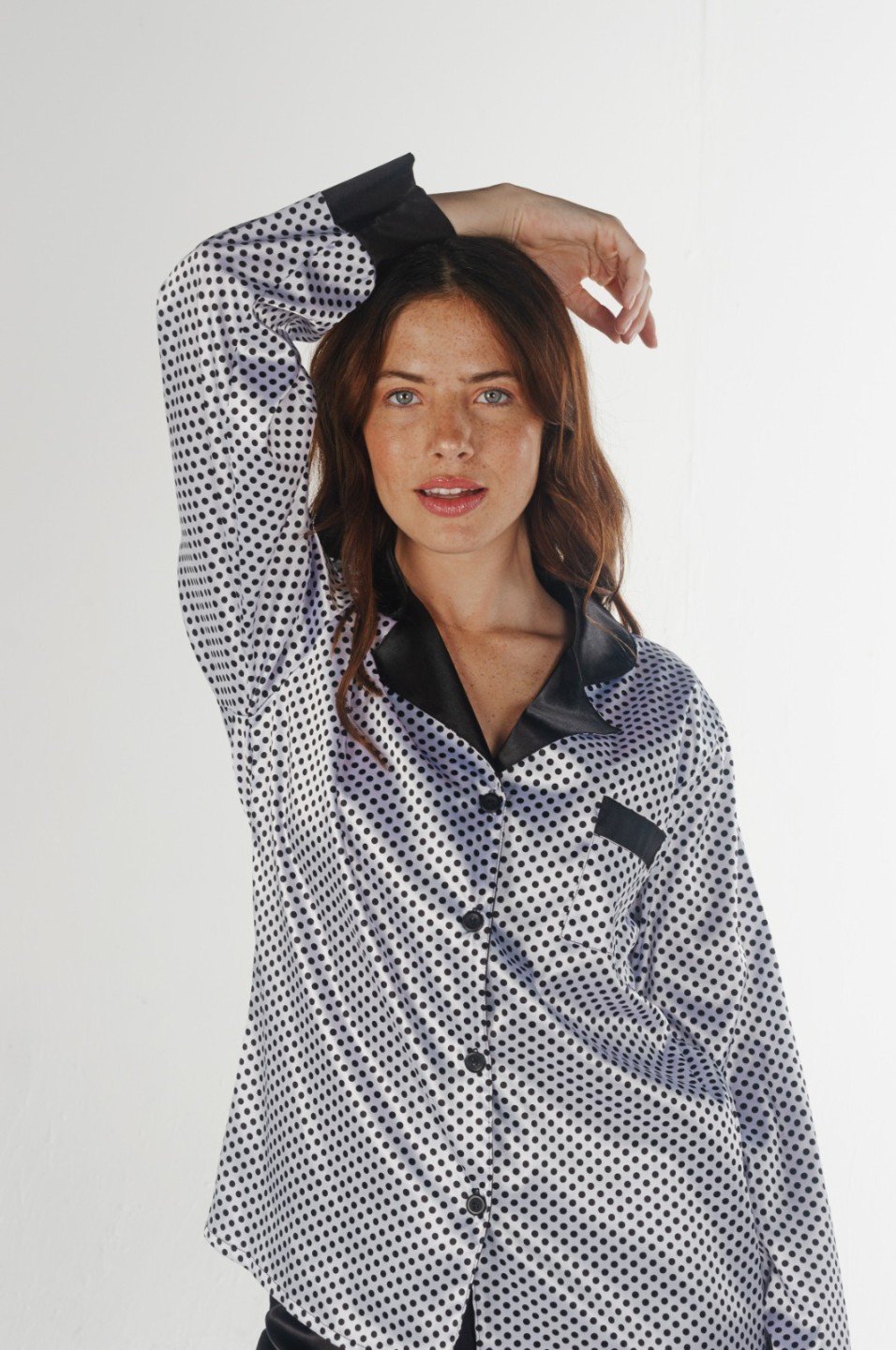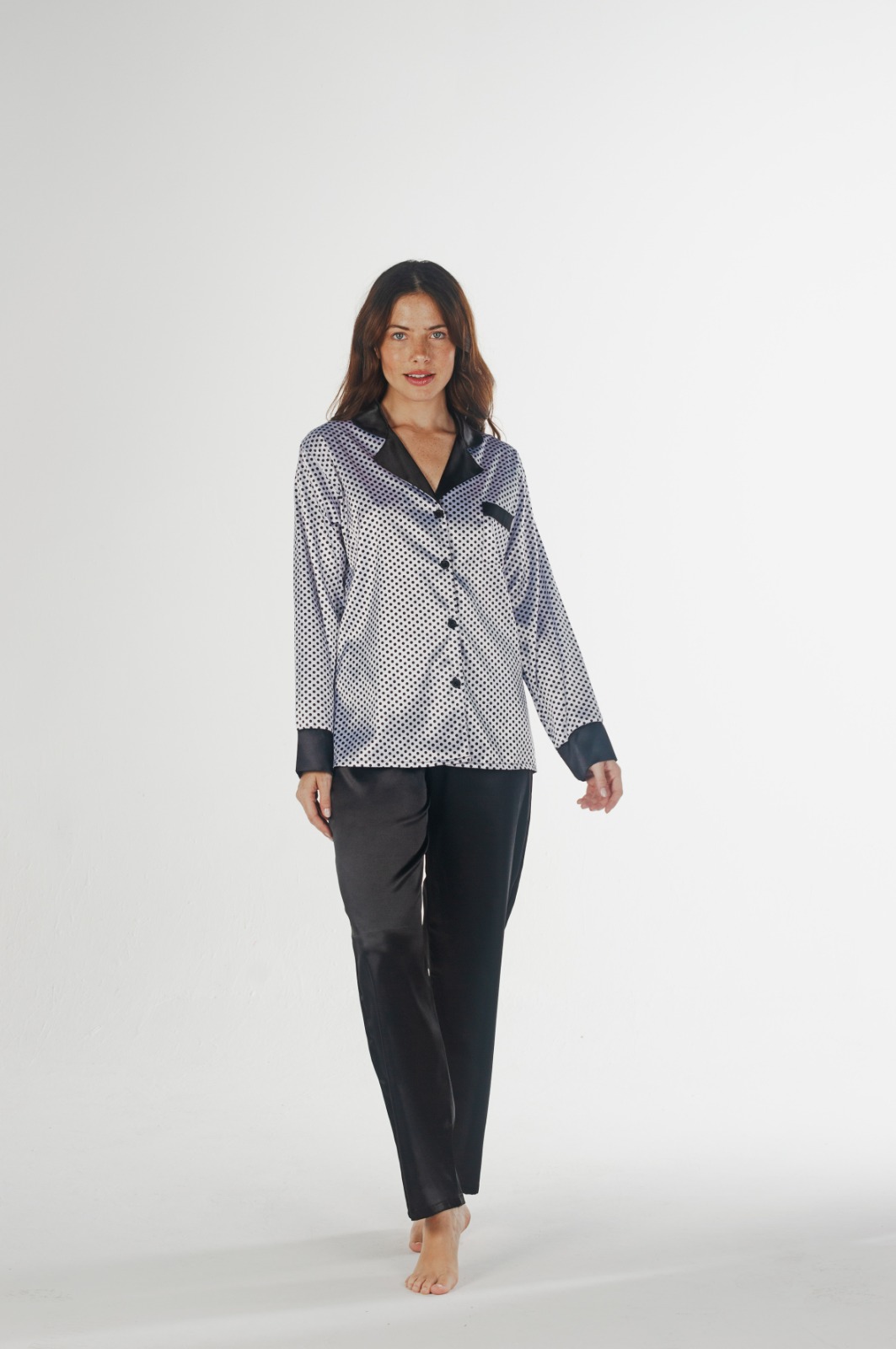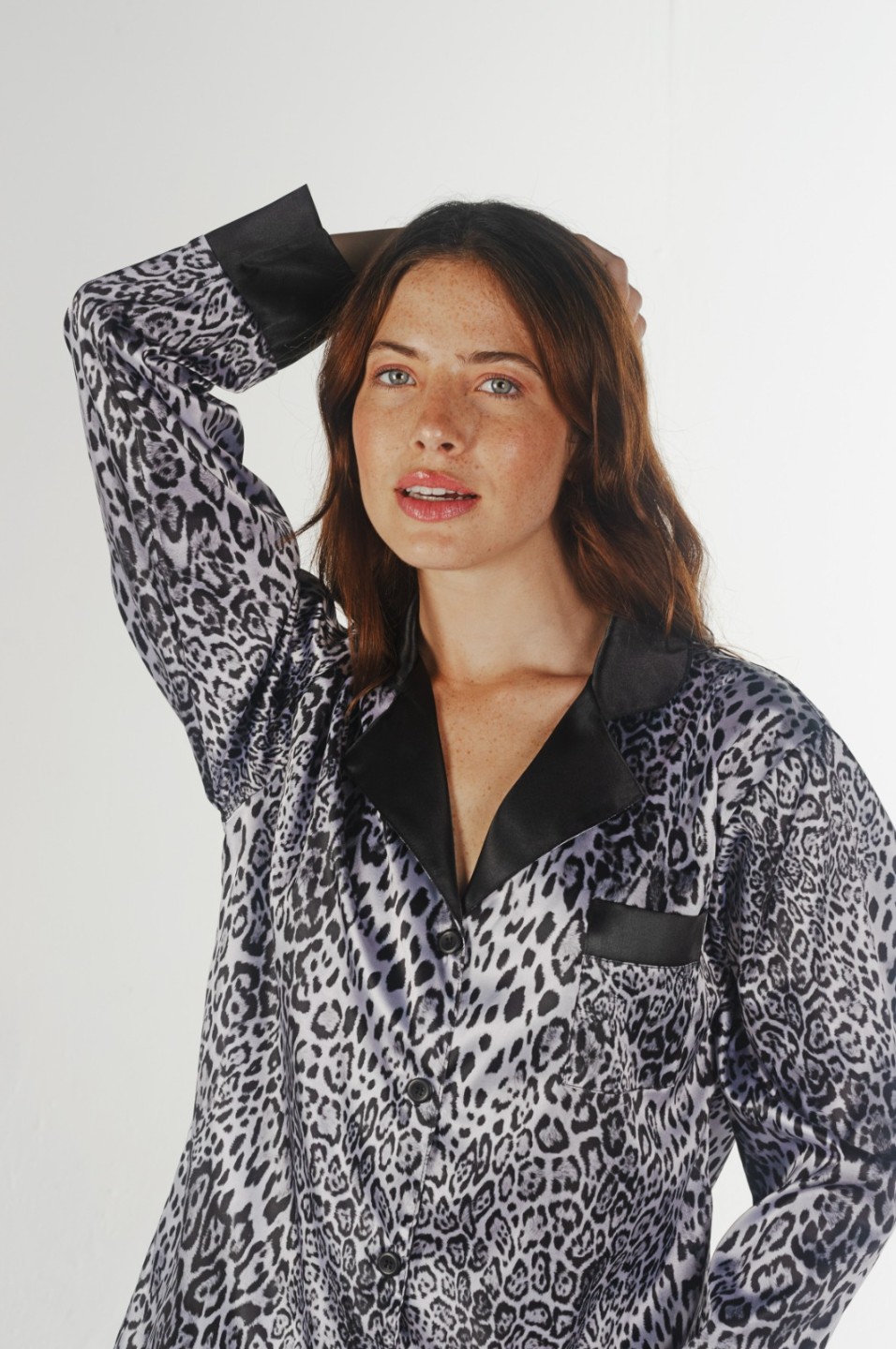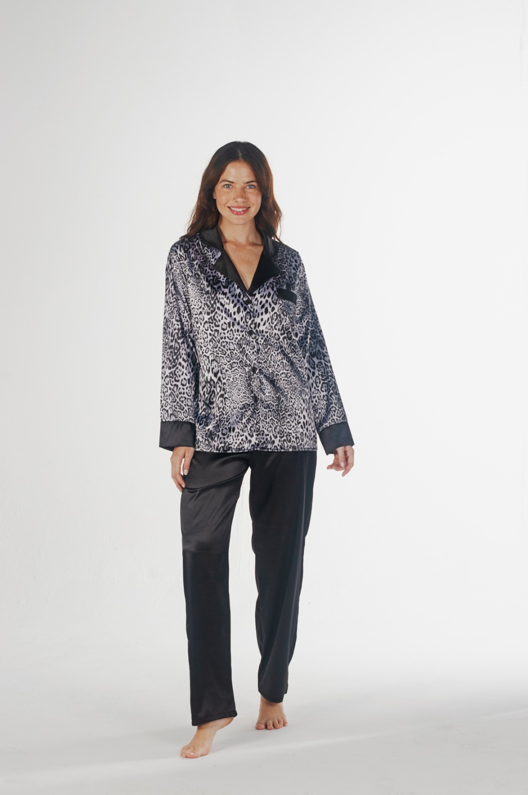 Pijama de saten estampado, con camisa prendida