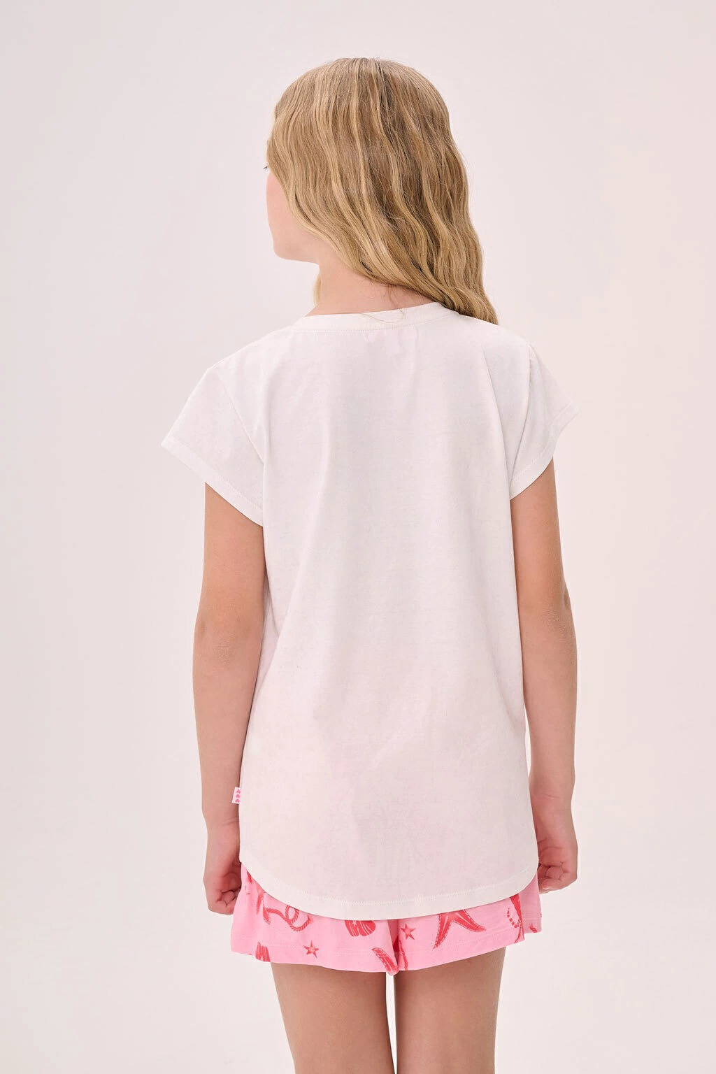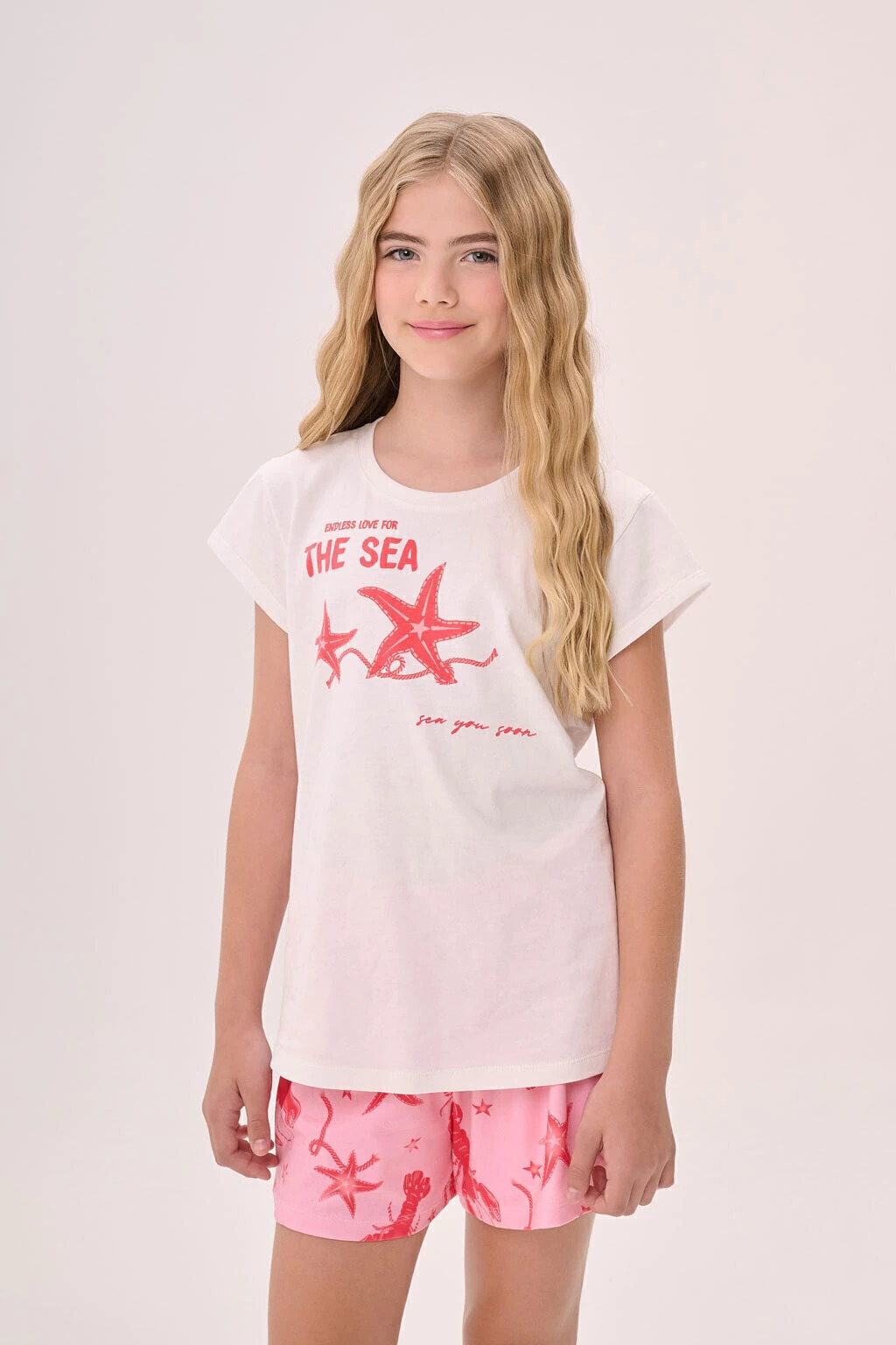 Remera blanca de algodón combinada con short estampado con colorido motivo de langostas.