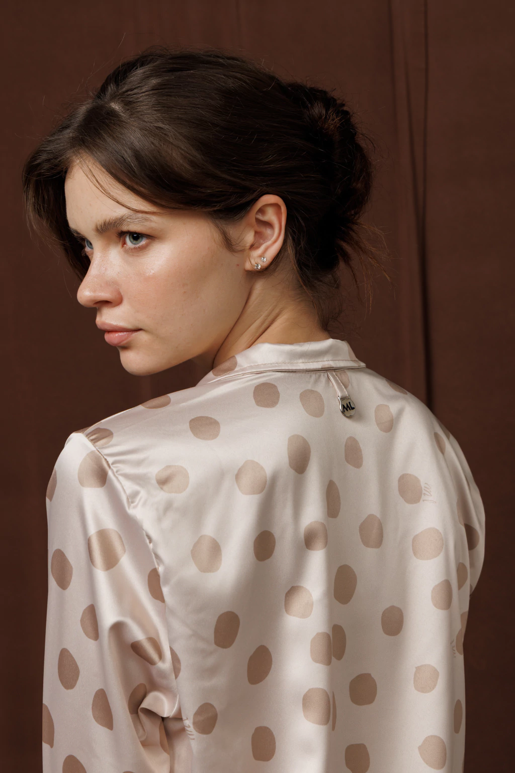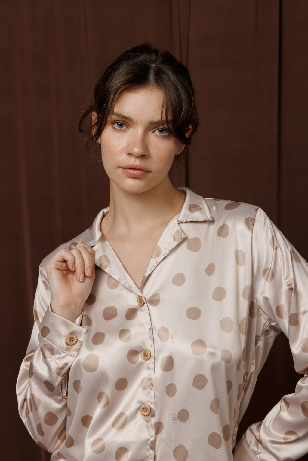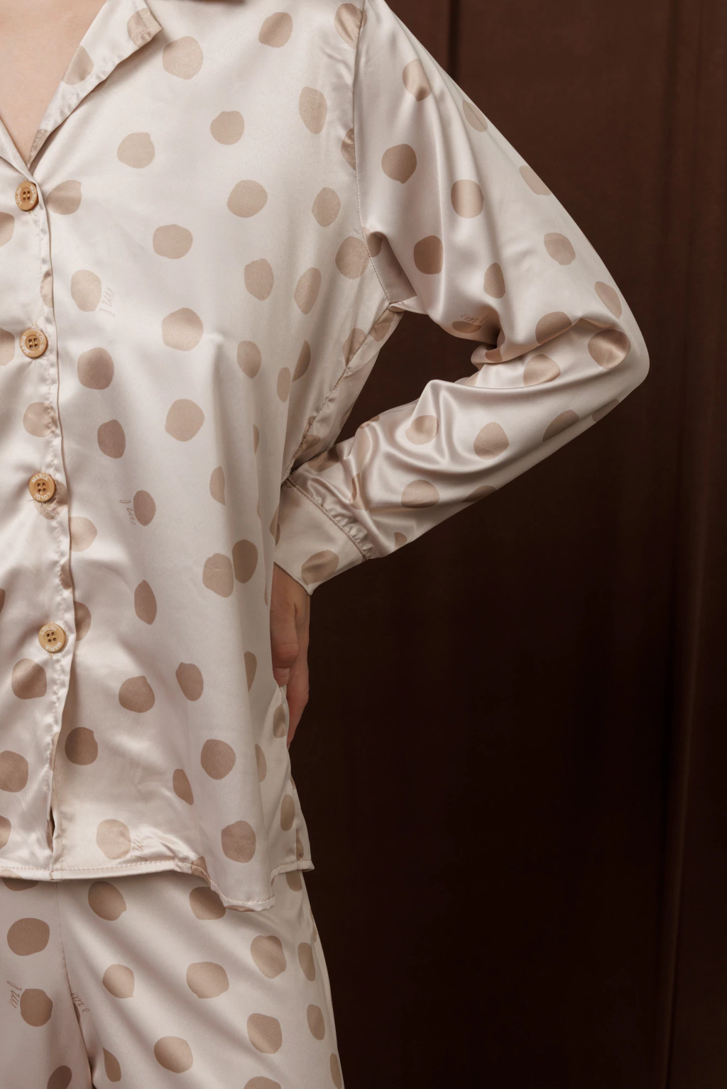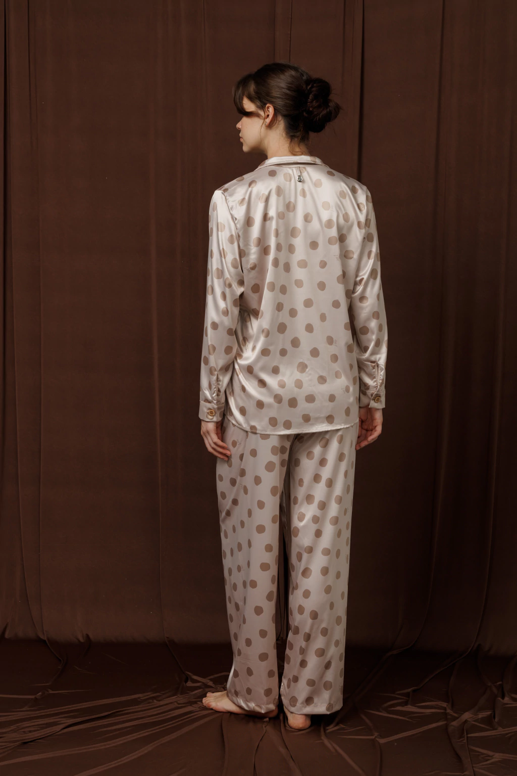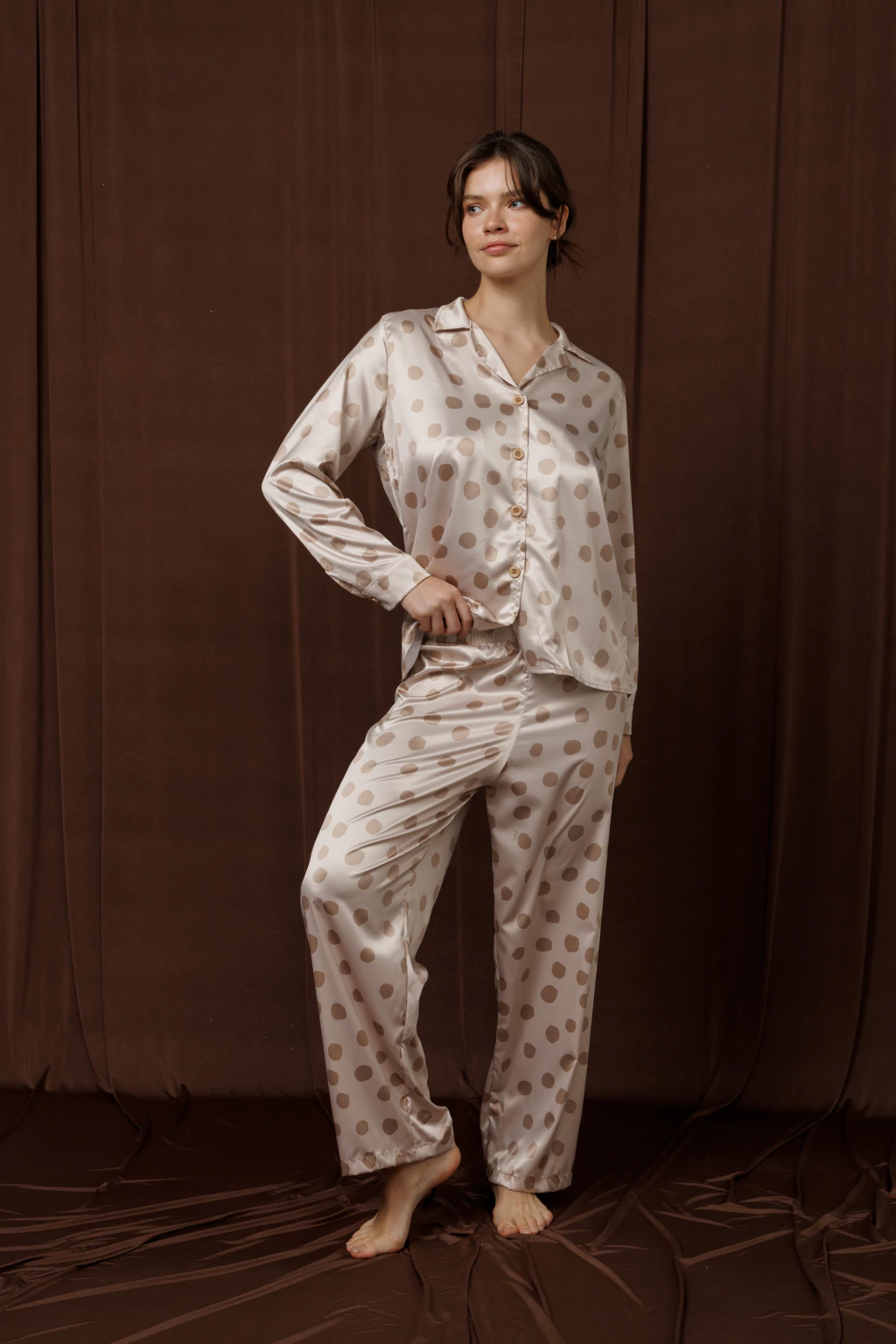 Conjunto de satén de camisa manga larga, corte recto, cerramiento delantero a través de 4 botones y botones el puños y pantalón recto tiro medio y elástico en cintura.