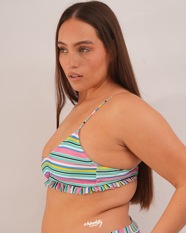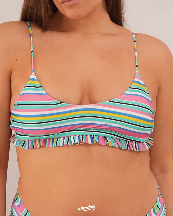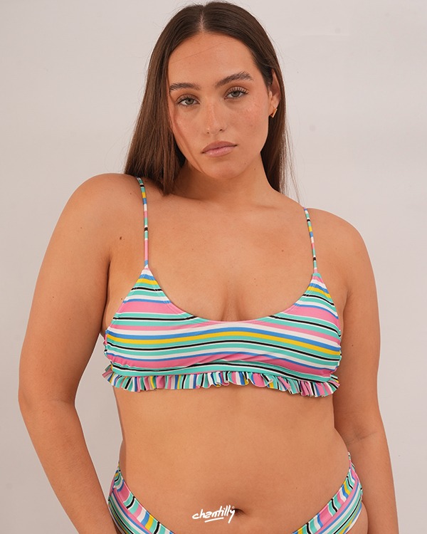 Viene con un elástico ancho en la base que brinda un buen agarre. Los breteles vienen con argolla y correderas, para poder regularlos a gusto. Forro al tono, doble. Viene con tazas soft desmontables. Forrado completo en color blanco.