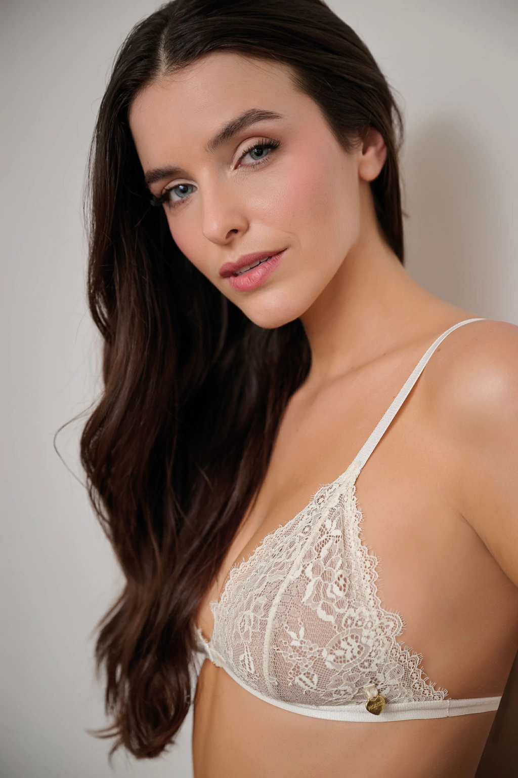 Corpiño de encaje, estilo triángulo, con prendedura en el frente