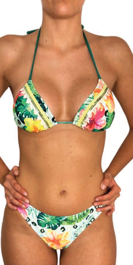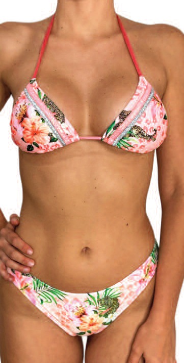 Triangulo de bikini de lycra estampada, con galones de lentejuelas. Almohadillas desmontables